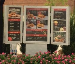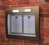 Menu boards are typically mounted near the sidewalk entrance to a restaurant where they are visible to pedestrian traffic. Menu boards are designed to change frequently and often feature a changeable face within a frame or cabinet attached to the side of a building or on a pedestal.