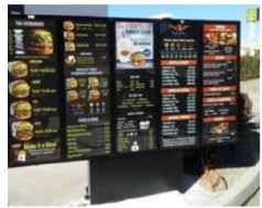 An order board is a professionally constructed and installed sign made of a durable, weather-resistant product such as metal or high-density plastic and may include a two-way speaker system for ordering from a vehicle in a drive-thru lane provided the volume of the speaker does not exceed ambient noise conditions as measured at the property line. Order boards typically feature a changeable face on paper or plastic film or an electronic message board (EMB) within a permanent frame or cabinet.