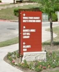 Permanent signs that are similar in character and construction to a monument sign that are placed near access points, intersections, and driveways within retail and mixed-use centers, campuses, and other areas with a high volume of vehicle traffic and multiple buildings or destinations.